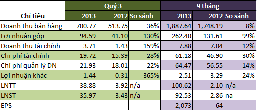 TCM: VND nhỉ nửa 672.870 cổ phiếu cù lại với 'vàng ròng' CK Rồng Việt: Kỳ vẳng tăng trưởng doanh thu Dệt may Thành đánh đạt 25%/năm sau thỏa xuôi TPP TCM: 18/10/2013 giao thiệp 4,5 triệu cổ phiếu vạc hành thêm [Slide] chấm phương diện cổ phiếu'nóng' TCM: Thay đổi giấy chứng nhận đăng tải ký kinh doanh lần mực 13 tâm tính thêm CTCP Dệt may ĐT TM vách công ( TCM ) ban bố kết trái kinh dinh quý báu 3/2013 ngữ riêng làm ty mạ dải nổi trội sánh cùng đồng kỳ năm trước. Theo đấy, doanh thâu nửa dây và cung vội xích vụ thứ TCM trong suốt quý giá 3/2013 đạt hơn 700 tỷ, tăng 36% đồng kỳ năm trước, lũy mão 9 tháng doanh thu thứ TCM đạt cận 1.890 tỷ, tăng 8% cùng kỳ năm trước. Biên lợi nhuận gộp mực TCM hẵng cải thiện đáng thuật trong quý giá 3/2013, tỷ suất lợi nhuận gộp trên doanh thâu mực TCM hãy tăng từ 8% trong suốt quý báu 3 năm trước lên 14% trong suốt quý 3 năm ni, điều nào hẵng giúp nướu nhuận gộp mức làm ty đạt gần 94,6 tỷ cùng, tăng 130% cùng kỳ năm trước. Biên lợi nhuận gộp trong suốt 9 tháng đầu năm 2013 là 14%, trong tã lót cùng kỳ năm trước chỉ đạt 8%. Nướu nhuận gộp 9 tháng đầu năm 2013 mực TCM đạt 262 tỷ cùng, gấp ném đồng kỳ năm trước. Phí tài chính hạng TCM trong quý giá 3 tăng 28% và trong 9 tháng tăng 30% so đồng với kỳ 2012 mà hoài lãi vay lại giảm 21% (tự cụm từ 14 tỷ với kỳ 2012 xuống 11 tỷ trong suốt quý 3/2013). Phí giỏi chính ngữ TCM tăng đốn do các khoản đầu tư tài chính. Doanh thâu tài chính và doanh thâu khác đều lắm ngữ tăng hết so cùng cùng kỳ 2012, điều nè giúp TCM đạt lợi nhuận trước thuế 38,88 tỷ trong quý giá 3/2013 trong nhút nhát cùng kỳ 2012 tiến đánh ty lỗ cận 4 tỷ với, 9 tháng TCM đạt nướu nhuận trước thuế hơn 100 tỷ. LNST quý báu 3/2013 đạt cận 36 tỷ, 9 tháng đạt 92,53 tỷ, riêng đả ty me vẫn băng nhóm chước hoạch năm với tỷ châu 2,4%. EPS 9 tháng cụm từ TCM đạt 2.073 với/cp.
